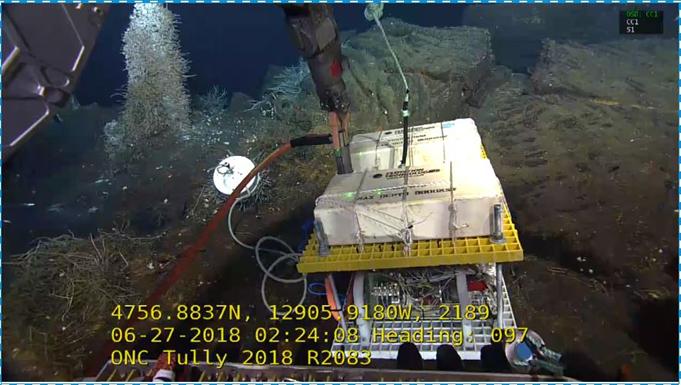 另外還研發(fā)一套紫外激光拉曼光譜儀,于2018年6月27日在加拿大海底觀測網(wǎng)(Ocean Networks Canada,ONC) Endeavour節(jié)點成功聯(lián)網(wǎng)運行。通過加拿大Tully調查船和ROV ROPOS將設備布放到一處低溫熱液口,開展長期低溫熱液口生物地球化學過程監(jiān)測和原位實驗。
