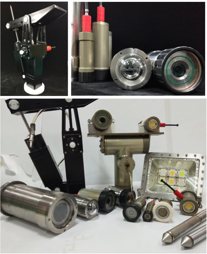 在開發(fā)大型深海資源開發(fā)裝備的同時,為解決許多深海常用元器件依賴進口,成本高,周期長等現(xiàn)象,自主研發(fā)多種深海常用的元器件,包括照明燈、閃光燈,模擬攝像機、網(wǎng)絡攝像機、SDI攝像機、高清相機、云臺、旋轉編碼器、磁控開關、鋰電池池等,這些元器件安裝在深海裝備上,經(jīng)過多次深海試驗驗證,完全可以取代國外進口裝備,部分元器件的最大工作水深達到11000米。下圖中是目前研發(fā)的多種深海通用元器件。