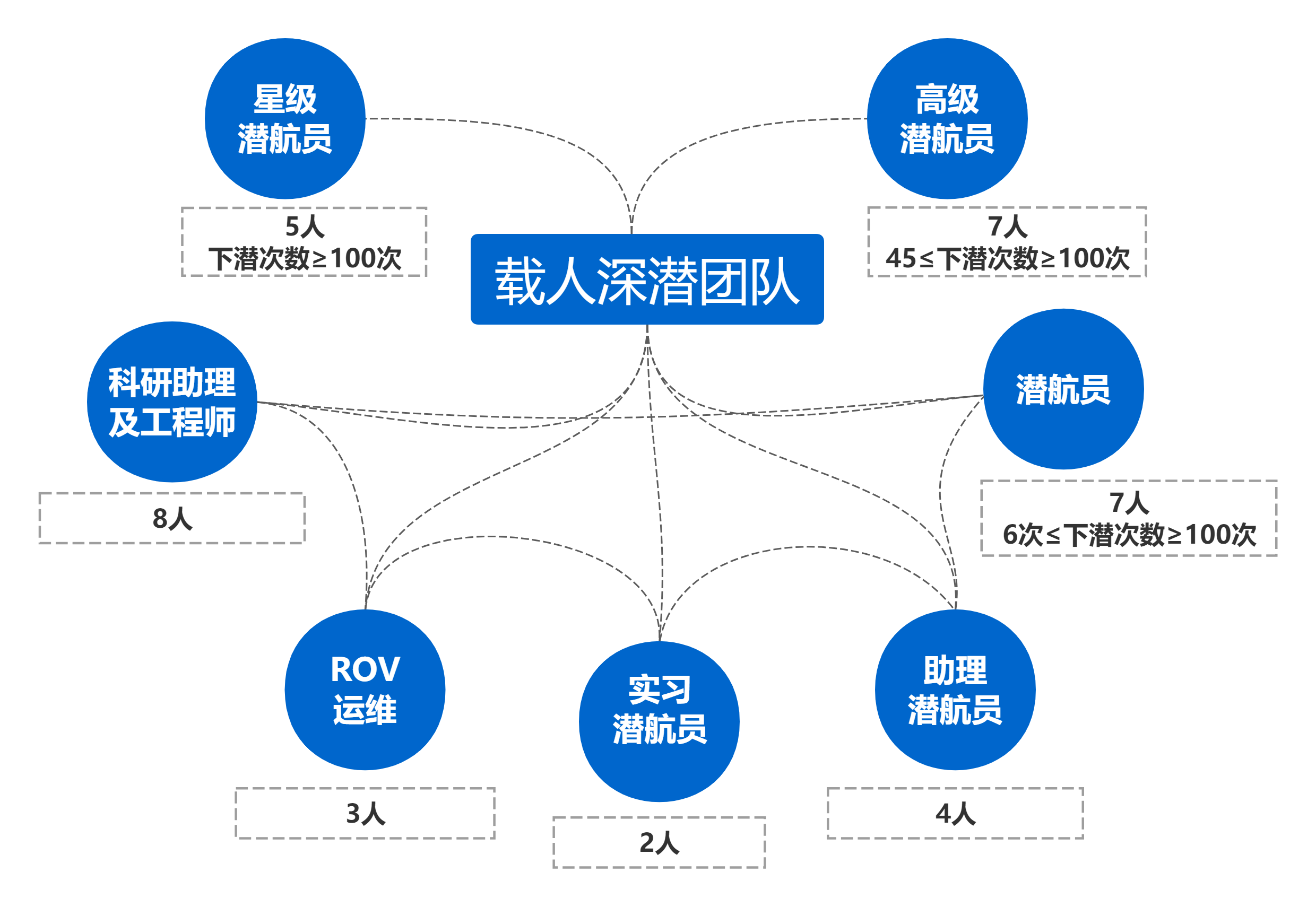 深潛技術研究室目前共有星級潛航員5人,高級潛航員7人,潛航員7人,助理潛航員4人,實習潛航員2人,ROV運維人員3人,科研助理8人。