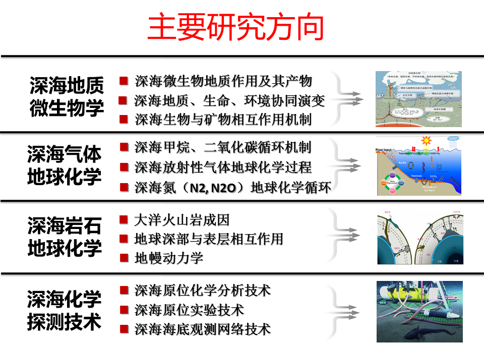 中國科學院深海科學與工程研究所“深海地質與地球化學研究室”成立于2013年,主要從事于深海地球化學、深海化學、深海巖石學和深海地質微生物學等領域的研究工作,關注深海地球科學領域與地質、環境、全球變化相關的重大科學問題,重點探討深海地質、地球化學以及生命等要素之間的相互作用機制及協同演化關系。同時,致力于研發深海地球化學原位探測技術與深海原位實驗技術,通過深海科學研究與深海技術研發的有機結合,挑戰深海地球科學領域前沿科學問題。
